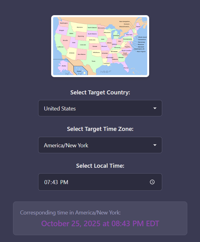 I work with people around the world and I often have to set up meetings with people on multiple continents. I needed a simple app that let’s me quickly calculate the time in another time zone based on the local time/date.